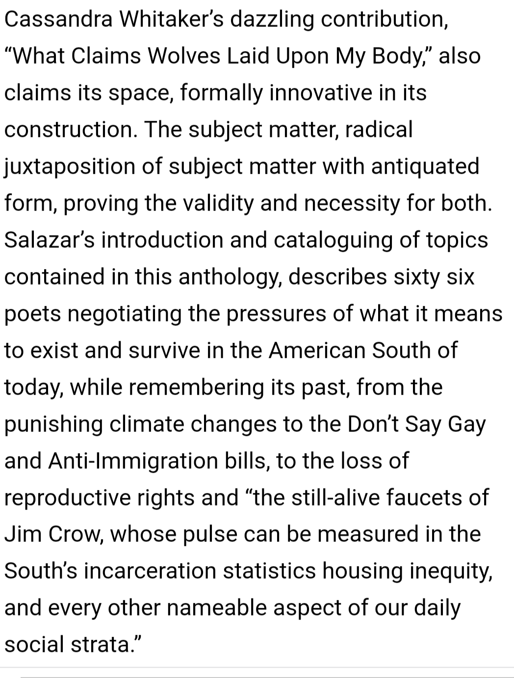 Cassandra Whitaker’s dazzling contribution, “What Claims Wolves Laid Upon My Body,” also claims its space, formally innovative in its construction. The subject matter, radical juxtaposition of subject matter with antiquated form, proving the validity and necessity for both.